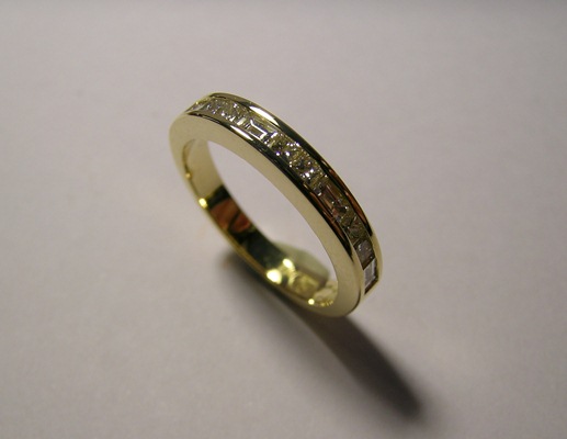 This delightful wedding ring combines channel set baguette and princess cut diamonds in a yellow gold band.