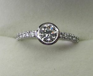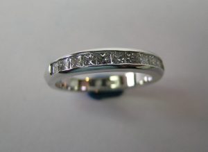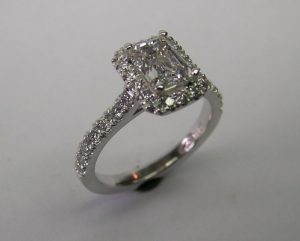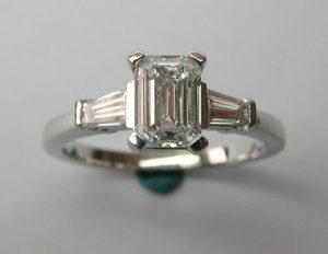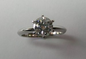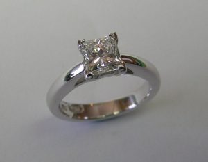 Over a carat and a half weight of shimmering diamond feature in this solitaire engagement ring. The princess cut stone is corner claw set in a white gold knife edge style band. Simply exquisite.