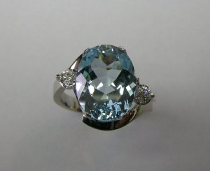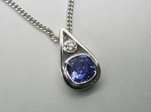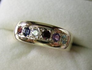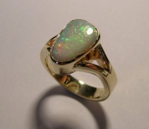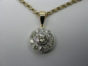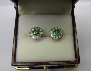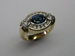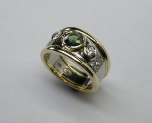 A contemporary style low set band of colour and lustre. This dress ring features a rose cut round green sapphire, bezel set in yellow gold, and round brilliant cut diamonds, bezel set in white gold on either side. The centre piece is then highlighted by round shoulder diamonds, pave set in the wide white gold centre band. The stylish ring design is completed with contrasting