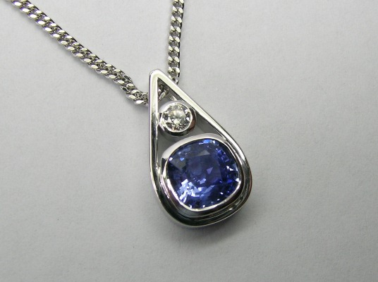 A quality gemstone and delightfully simple design are highlights of this ladies pendant. The beautiful blue cushion cut Ceylon sapphire is bezel set in white gold, and complemented by the adjoining bezel set round brilliant cut diamond. The stones are then set into a white gold teardrop shaped casing. An exquisite adornment for the sophisticated lady.