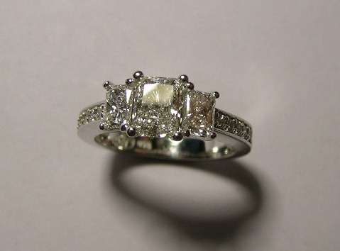 Quality stones and a timeless design feature in this sensational engagement ring. Over a carat and a half of diamonds sparkle in their white gold band and settings. Three claw set radiant diamonds and ten shared claw pave set brilliant cut shoulder diamonds wrap around the finger to create a ring of sparkle.