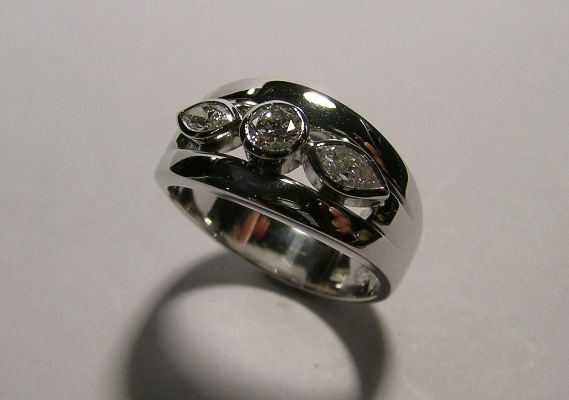 A round brilliant cut centre diamond is complemented by marquise diamonds either side in this white gold ladies dress ring. The wide solid band and bezel settings complete the look to make this a remarkable all occasion piece.