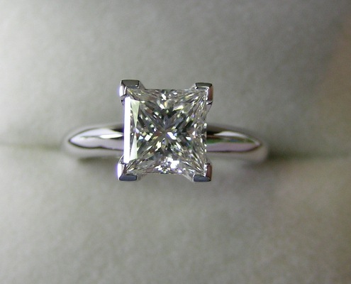 Over a carat and a half weight of shimmering diamond feature in this solitaire engagement ring. The princess cut stone is corner claw set in a white gold knife edge style band. Simply exquisite.